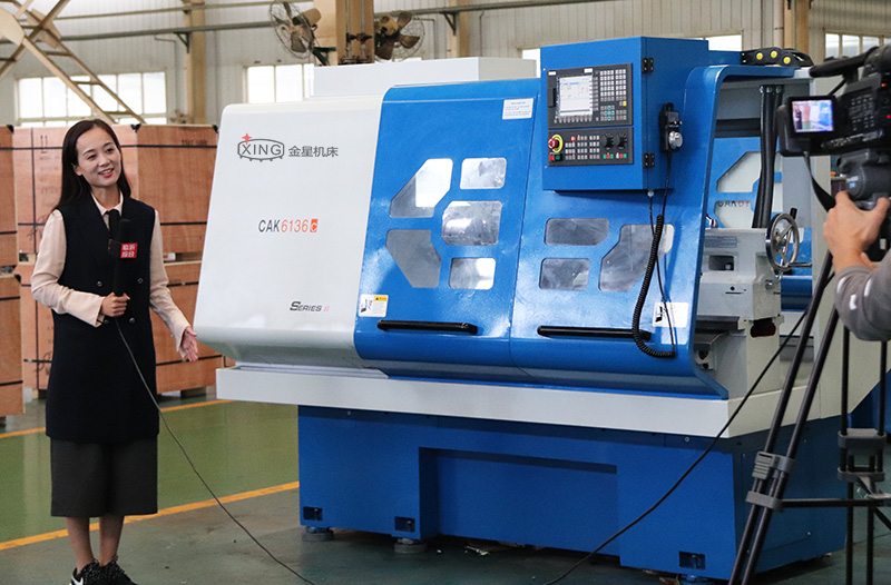 圖為主持人董迪對我廠研發(fā)的新產(chǎn)品車銑復(fù)合機(jī)床進(jìn)行介紹報道