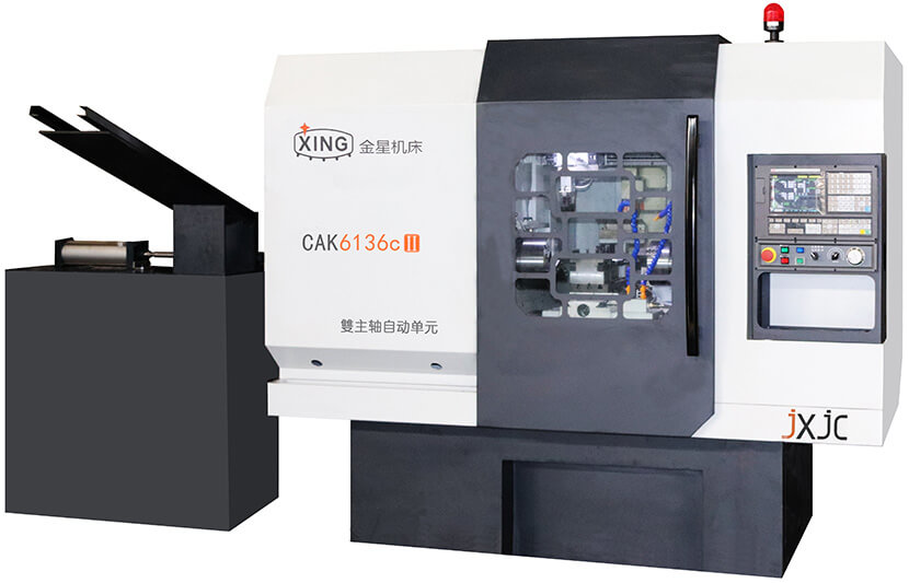雙主軸兩端自動加工數控車床特別適宜加工各種形狀復雜的軸類零件,一次裝夾能夠完成車、鉆、攻等工序加工,提高了工序復合的程度,降低了設備投入,既保證了零件的加工精度,又減少了工序的周轉等輔助時間,并大幅降低對操作者技能的要求,減輕工人的勞動強度。雙主軸自動加工單元尤其適合多品種、中小批量的輪番加工,工藝適應性強,加工效率高,廢品率低,產品加工一致性好,可降低對工人技術熟練程度的要求。